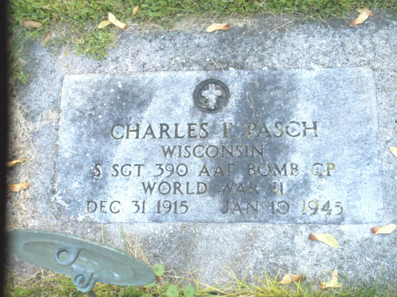 | Cemetery: | Inscription:S Sgt 390 AAF Bomb GP World War II Kiel Cemetery Kiel Manitowoc County Wisconsin, USA Charles F Pasch (1915 - 1945) - Find A Grave Memorial |