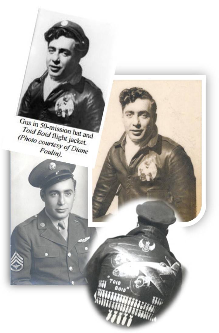 Hij werd geboren in St. Joseph de Beauce, provincie Quebec, Canada, en zijn familie verhuisde naar Skowhegan, Maine toen hij nog heel jong was. Hij ging naar de middelbare school in de provincie Quebec, werd volledig tweetalig en speelde hockey en andere sporten. Hij wees een kans af om voor het hockeyteam Boston Bruins uit te proberen om in oktober 1941 lid te worden van de USAAF. Hij werd opgeleid op Lowry Field als wapenmaker. Vervolgens meldde hij zich in de zomer van 1942 op MacDill Field als vrijwilliger om schutter te worden en trainde hij op Tyndall Field, Florida. Hij werd lid van de 323rd Bomb Group, het vluchtechelon van het 453rd Bomb Squadron en vloog in het voorjaar van '43 met kapitein Travis via de zuidelijke route naar de ETO. Hij nam op 17 juli deel aan de eerste 323e missie naar de Abbeyville Marshalling Yards. Eind '43 werd hij bijna voor de krijgsraad gebracht omdat hij zijn broer, Joseph Guy Poulin als staartschutter aan boord van een B26 had geslopen. Joseph was in die tijd een B17-kanonschutter. Zoals u zich wellicht kunt voorstellen, hadden ze meer dan een paar levendige discussies over de relatieve verdiensten van de twee vliegtuigen, de B17 en de B26. Na 50 missies te hebben gevlogen, kwam Gus in mei 1944 met verlof thuis. Toen hij weer aan het werk was, raakte hij gewond toen een stuk luchtafweergeschut zijn helm doorboorde in augustus. Toen Parijs werd bevrijd, werd hij als tolk naar de Franse ondergrondse gestuurd om een neergestorte piloot te bergen. Na zijn herstel bleef hij vliegen tot 19 november, na 71 missies te hebben gevlogen, meestal als boven koepel / schutter.